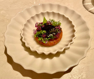 Geranium is located in what looks like a nondescript office building. The location is about 10 minutes or so out of the city center next to a large park called Faelledparken (the restaurant does have nice views of the park). There’s a large surface parking lot next to an 8-story building with a nicely portioned-off elevator which takes you to the restaurant. On exiting the elevator, the restaurant seems to occupy the entire floor and is very sleek and modern featuring a Scandinavian minimalist design with light woods and white décor. The room is open with all of the tables located in one main area. There are a few small serving stations placed around the room with minimal floral arrangements and the table tops were bare. The flatware was minimalist as well and most of the dishes were served on plain white porcelain or ceramic vessels. My overall impression was that, while the food was formal, the setting was intended to put you at ease. There were not a lot of distractions in the room or on the table to take away from the enjoyment of the service (which was superb) or the food. Like being at a spa, once you were settled in it was easy to let go of the stress of the day and relax. During a break in the lengthy meal service, we did get a tour of the wine service area (the full cellar was elsewhere) as well as a walkthrough of the kitchen. That was a nice touch and also helped to connect you to the people working there.